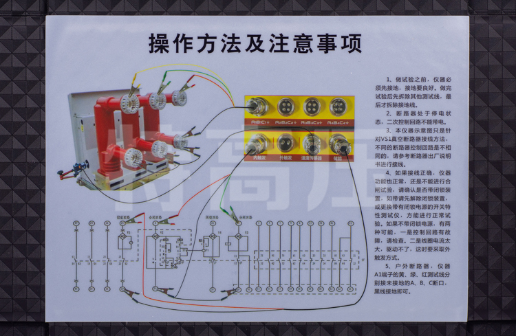 - 3、機(jī)內(nèi)集成式操作電源,無(wú)須現(xiàn)場(chǎng)二次電源,使用方便快捷??商峁〥C20~270V可調(diào)電源,電流20A。具有短路保護(hù)功能,如發(fā)生短路現(xiàn)象,1ms停止電壓電流輸出,發(fā)出滴滴報(bào)警聲響,提示操作人員檢查線路。獨(dú)特的雙回路電源設(shè)計(jì),如合閘或分閘控制回路中的一路損壞,用另一路也可測(cè)試合閘和分閘。