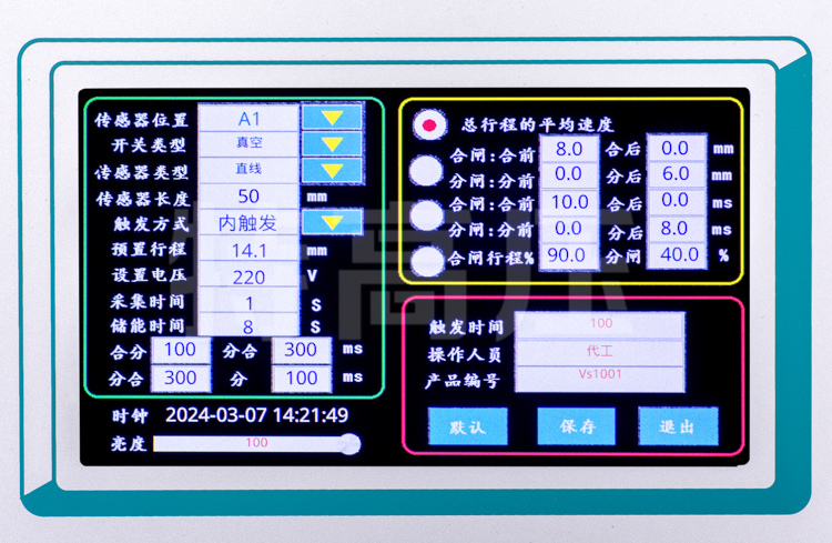 - 2、7寸彩色高亮屏(亮度可調(diào)節(jié)),太陽(yáng)底下操作也清晰可見(jiàn)。菜單式操作,快速測(cè)試界面,一鍵操作,支持中英文輸入。12路斷口狀態(tài)中文顯示,時(shí)間、行程、速度及波形同屏顯示,無(wú)需翻頁(yè)查看數(shù)據(jù)。分析指定段平均速度,并在行程曲線標(biāo)出,方便查看。內(nèi)置21種常規(guī)類型斷路器速度定義,只需選擇開(kāi)關(guān)類型,一鍵測(cè)量。