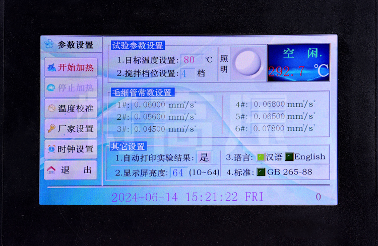 - 3、油產(chǎn)品運(yùn)動(dòng)粘度測(cè)定儀采用800×480點(diǎn)大屏幕彩色觸摸屏液晶顯示器,熱敏性打印機(jī),中英文顯示界面,操作方法簡(jiǎn)單