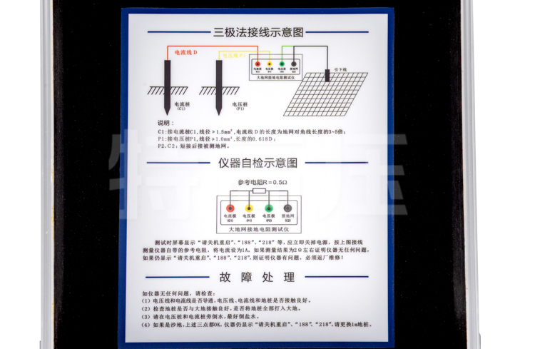 • 3、精度高?;菊`差僅0.005Ω,可用來(lái)測(cè)量接地阻抗很小的大地網(wǎng)。